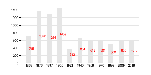 На 1 января 2018 года насчитывалось 574 жителя в 225 домохозяйствах, из них 100 младше трудоспособного возраста, 327 — в трудоспособном возрасте и 147 — старше трудоспособного возраста[8].