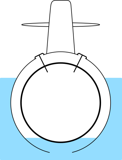 В надводном положении лодка плавает с открытыми кингстонами и аварийными захлопками. Клапаны вентиляции закрыты. Лодку удерживает на поверхности подушка воздуха в ЦГБ. Достаточно открыть клапаны вентиляции, и подпирающая вода вытеснит воздух — лодка начнет погружаться.