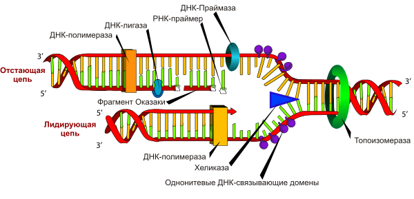 Репликация ДНК — процесс удвоения молекулы ДНК перед делением клетки. Основан на принципе комплементарности: каждая цепь двойной спирали служит матрицей для синтеза новой комплементарной цепи.