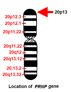 Был идентифицирован ген, кодирующий нормальный белок PrP — PRNP[82], локализованный на 20-й хромосоме. При всех наследственных прионных заболеваниях имеет место мутация этого гена. Было выделено много различных мутаций (около 30[11]) этого гена, и получающиеся при этом мутантные белки более склонны к укладке в ненормальную (прионную) форму[79]. Все такие мутации наследуются аутосомно-доминантно[11]. Это открытие показало дыру в общей теории прионов, гласящей, что прионы могут переводить в прионную форму только белки идентичного аминокислотного состава. Мутации могут иметь место по всему гену. Некоторые мутации приводят к растяжению октапептидных повторов на N-конце белка PrP. Другие мутации, приводящие к появлению наследственной прионной болезни, могут происходить в позициях 102, 117 и 198 (синдром Герстмана — Штраусслера — Шейнкера), 178, 200, 210 и 232 (болезнь Крейтцфельдта — Якоба) и 178 (фатальная семейная бессонница).