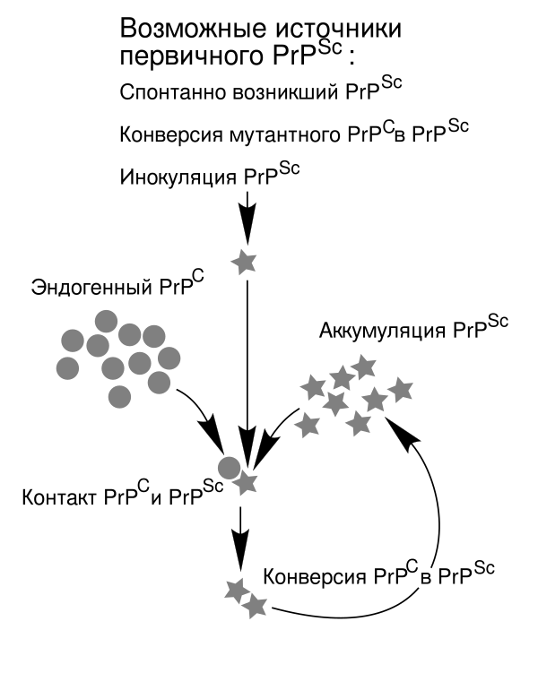 Инфекционная изоформа PrP — PrPSc — способна превращать нормальный белок PrPC в инфекционную изоформу, изменяя его конформацию (то есть третичную структуру); это, в свою очередь, изменяет взаимодействия PrP с другими белками. Хотя точная пространственная структура PrPSc неизвестна, установлено, что в ней вместо α-спиралей преобладают β-слои[34]. Такие ненормальные изоформы объединяются в высокоструктурированные амилоидные волокна, которые, скапливаясь, формируют бляшки. Неясно, являются ли эти образования причиной повреждения клеток или всего лишь побочным продуктом патологического процесса[35]. Конец каждого волокна служит своего рода затравкой, к которой могут прикрепляться свободные белковые молекулы, в результате чего фибрилла растёт. В большинстве случаев присоединяться могут только молекулы PrP, идентичные по первичной структуре PrPSc (поэтому обычно передача прионов видоспецифична)[9]. Однако, возможны и случаи межвидовой передачи прионов[36].