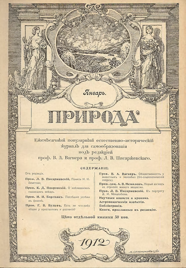 Первый номер журнала «Природа» вышел в Москве 26 января (8 февраля) 1912 года тиражом в 5 тысяч экземпляров. Его редакторами были В. А. Вагнер и Л. В. Писаржевский. Обложка в стиле «русский модерн» была работы художника М. И. Соломонова. В обращении к читателям «от редакции» Вагнер и Писаржевский писали, что считают такой журнал «лучшим средством борьбы с предрассудками, с влиянием схоластики и метафизики». Редакторы также заявляли о «своей глубокой убеждённости в великом общественном значении распространения научных истин»[4].
