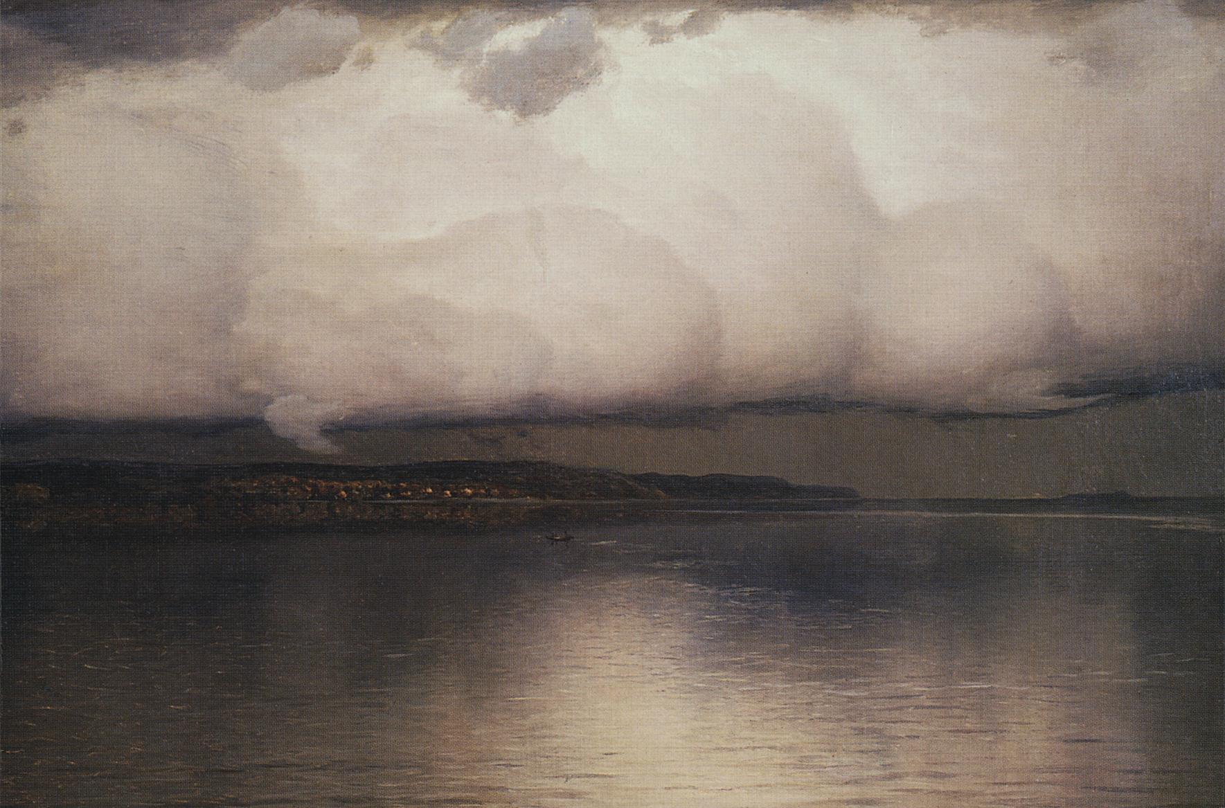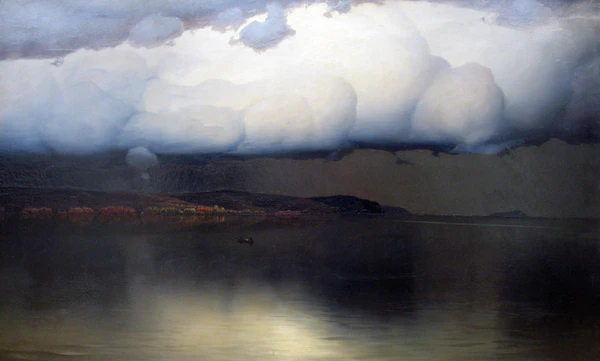 На картине изображены освещённые солнцем грозовые тучи, нависшие над водной поверхностью. Их верхняя часть напоминает белую вату, а нижняя наполнена зловещей чернотой. Ветра нет, и в гладкой поверхности воды отражаются светлые и тёмные тучи. Вдали виден холмистый берег, на котором находятся домики какого-то селения[4][18]. Яркие оранжево-красные кроны деревьев и кустов, выделяющиеся на фоне тёмного леса, подчёркивают напряжённость атмосферы[19]. К берегу направляется небольшая одинокая лодка с гребцом, который, по-видимому, пытается достичь суши до наступления непогоды[4][18].