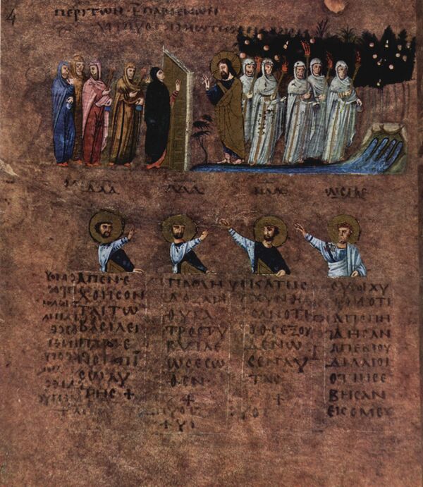 Тогда подобно будет Царство Небесное десяти девам, которые, взяв светильники свои, вышли навстречу жениху. Из них пять было мудрых и пять неразумных. Неразумные, взяв светильники свои, не взяли с собою масла. Мудрые же, вместе со светильниками своими, взяли масла в сосудах своих. И как жених замедлил, то задремали все и уснули. Но в полночь раздался крик: вот, жених идёт, выходите навстречу ему. Тогда встали все девы те и поправили светильники свои. Неразумные же сказали мудрым: дайте нам вашего масла, потому что светильники наши гаснут. А мудрые отвечали: чтобы не случилось недостатка и у нас и у вас, пойдите лучше к продающим и купите себе. Когда же пошли они покупать, пришёл жених, и готовые вошли с ним на брачный пир, и двери затворились; после приходят и прочие девы, и говорят: Господи! Господи! отвори нам. Он же сказал им в ответ: истинно говорю вам: не знаю вас. Итак, бодрствуйте, потому что не знаете ни дня, ни часа, в который приидет Сын Человеческий.