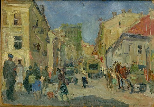 На полотне представлен городской летний пейзаж: на первом плане изображена узкая улица, по которой идут люди, что отражает сцену из повседневной жизни в традициях бытового жанра. Справа находится лошадь с повозкой, в которой сидит мужчина. Над крышами домов простирается голубое небо, придающее композиции ощущение простора и летней атмосферы. Сцена построена с вниманием к деталям городской среды и движению фигур в пространстве композиции.
