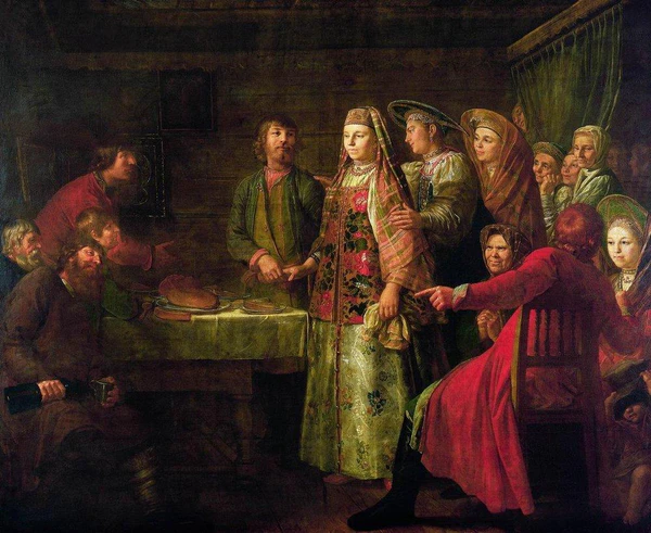 Во время работы над картиной Максимов часто советовался с крестьянами и принимал во внимание их критику. Художник Илья Репин писал, что Василий Максимович до тех пор не считал своей картины законченной, «пока она не была совершенно одобрена» крестьянами. В качестве примера Репин приводил рассказанный Максимовым диалог: «— Нет, постой, постой, а это? — спрашивает бойкий сосед. — Кто? — „Дру́жку“ мнил тут посадить. — Что ты, что ты! Разве ему это место? Тут надо кого постарше, не сватов посадить. Опять же дру́жка у тебя млад — неопытен. Да и не боек — скучноват обличьем… Гли-ко, вот покажу тебе дру́жку. Вишь, какая весёлая, широкая рожа! Да его всегда и берут на свадьбы: балагур, весельчак…» После этого следует общий хохот, и «излюбленный „дру́жка“ изъявляет полное желание посидеть для картины»[34].