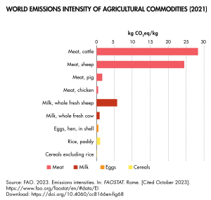 Среди всех сельскохозяйственных товаров мясо крупного рогатого скота и овец отличается самой высокой интенсивностью выбросов