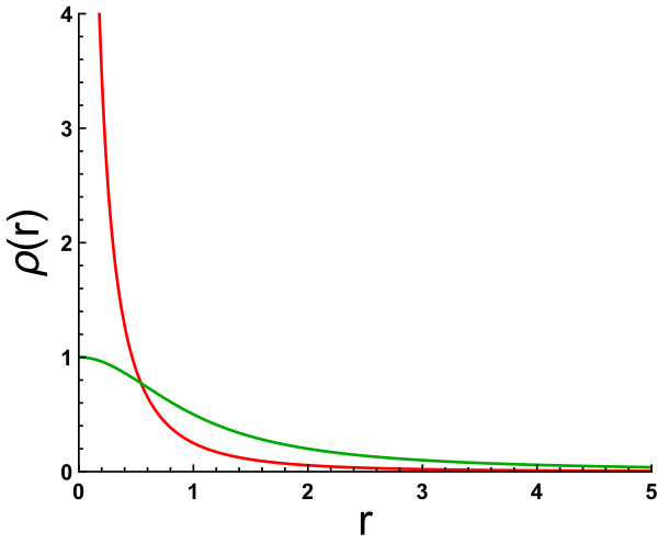 где ρ0 — параметр, определяемый плотностью вещества Вселенной в момент формирования гало, Rs — характеристический радиус гало. Предлагались и другие варианты зависимости , но все они дают значения показателя для центральных областей (r < 1 кпк). Соответствующие кривые вращения предполагают рост скорости пропорционально [14][9].