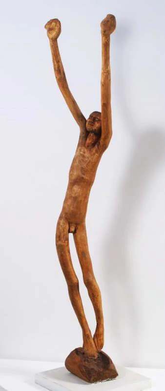 Скульптура выполнена в круглой форме из дерева. Работа изображает обнажённого юношу, представленного во фронтальной проекции. Фигура имеет вертикально вытянутую форму. Торс наклонён вправо и немного развёрнут влево. Лицо юноши имеет круглую форму, а черты лица и волосы выполнены рельефно. Руки подняты вверх, пальцы собраны в кулак. Фигура стоит, делая упор на правую ногу, и крепится к небольшому предмету, имитирующему камень. Постамент невысокий, квадратной формы. Размер работы составляет 204×48 см, а размеры постамента — 21×25×17 см.