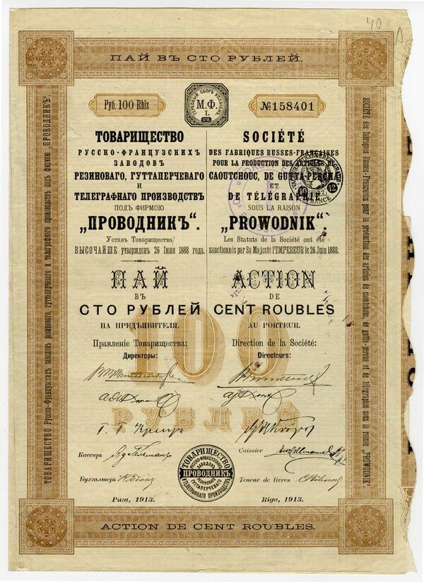 Временем основания этого преуспевающей компании считается 1888 г. 26 июня того года был Высочайше утвержден Устав Товарищества русско-французских заводов резинового, гуттаперчевого и телеграфного производств под фирмой "Проводник" - акционерного общества, владевшего предприятием.[3] Основной капитал Товарищества на момент учреждения составлял сумму в 700 тысяч рублей, сполна оплаченных на паях участниками товарищества. В последующие годы размер основного капитала компании неоднократно увеличивался. На раннем этапе развития товарищества «Проводник» в нём трудилось 650 рабочих. На конец XIX века предприятие стабильно заняло второе место по уровню производства продукции в пределах России (первое место традиционно занимало столичное предприятие «Треугольник»). Перед войной «Проводник» занимал третье-четвёртое место в мире по количеству произведённой продукции, а компетентные европейские эксперты признавали, что «Проводник» мог смело претендовать на первое место в мировом масштабе по качеству продукции.