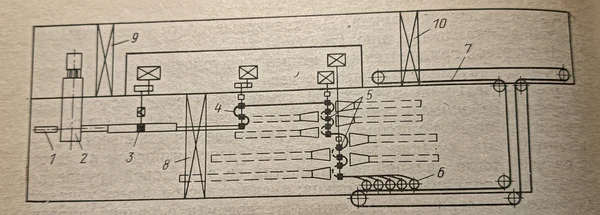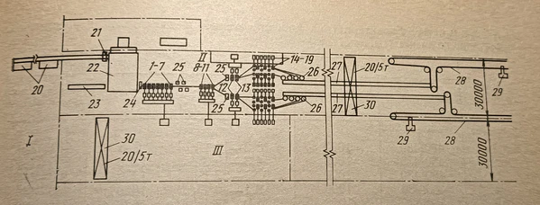 Полунепрерывные проволочные станы состояли из трёх непрерывных групп клетей и двух чистовых линий. Они были более производительны по сравнению с линейными, но всё равно сохраняли «узкое место» — обжимную линию, которая заметно тормозила дальнейший технологический процесс[2].