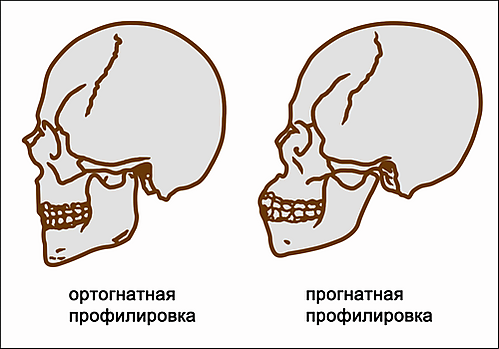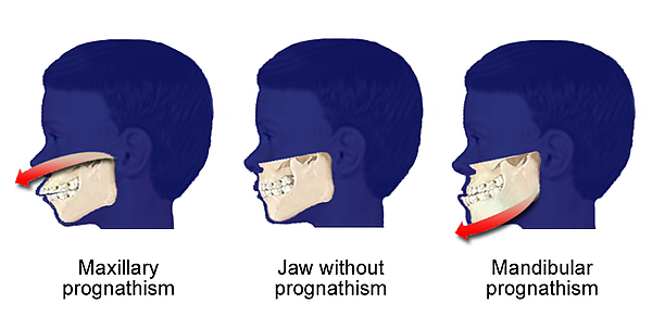 Прогнатизм предполагает выступающие вперёд челюсти, кроме того, нижняя челюсть лишена подбородочного выступа[2]. Эти черты создают острый лицевой угол, который при прогнатизме составляет до 79,9°[3]. Подобное строение лица встречается в разных расовых группах, однако оно более характерно для негроидной расы и южных монголоидов[1].