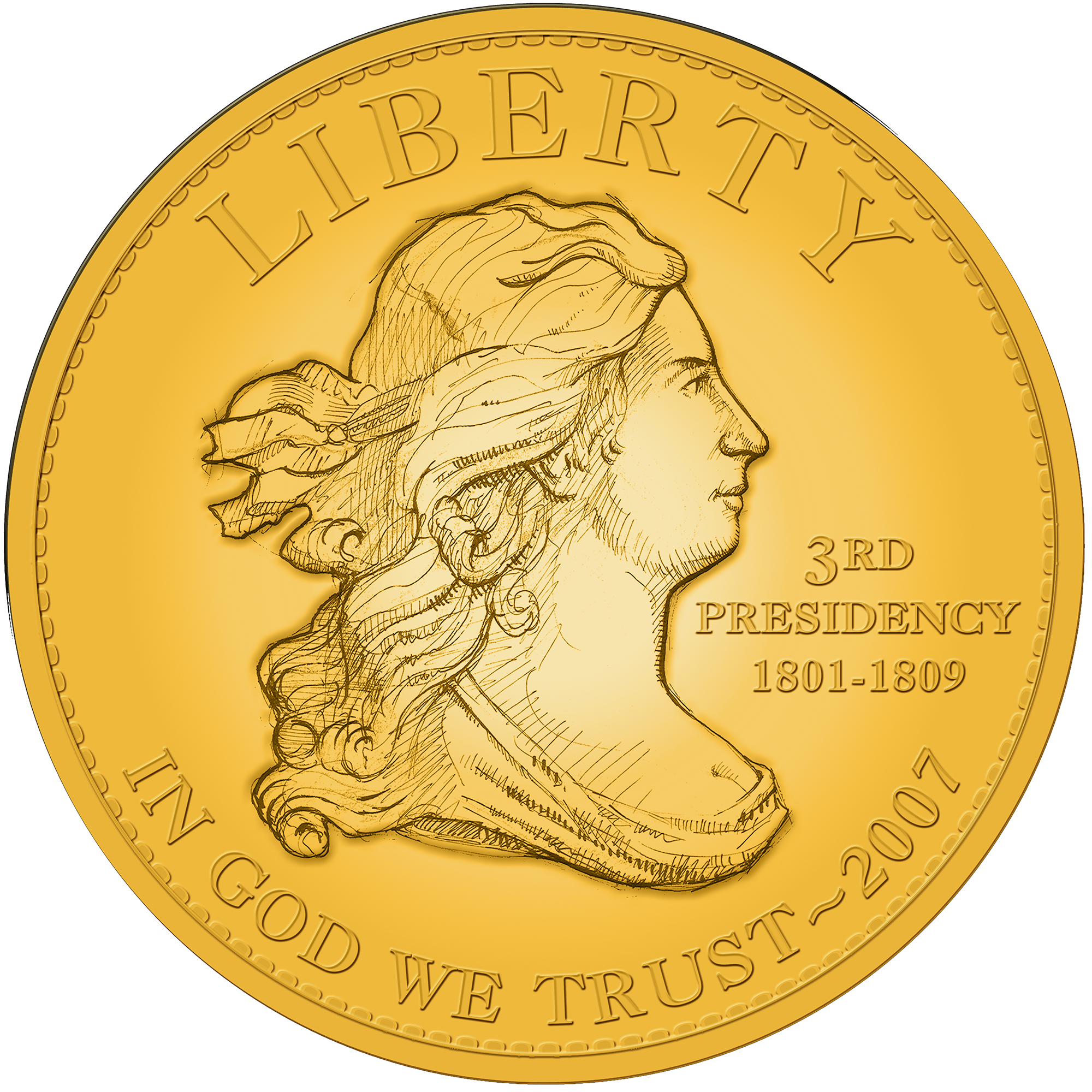 Если президент был холост в течение президентского срока, как Томас Джефферсон, будет отчеканена золотая монета с изображением на аверсе Свободы в виде, принятом в течение правления президента, и эмблематикой президента на реверсе.