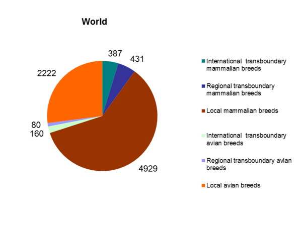 В рамках ФАО в 1983 году был образован межправительственный форум — Комиссия по генетическим ресурсам для производства продовольствия и ведения сельского хозяйства, которая проводит мониторинг мировых ресурсов и вырабатывает меры по их оценке, использованию и сохранению. Так, по данным этой Комиссии, всего в мире имеется около 8300 пород домашних животных, однако 8 % из них считаются уже вымершими и 22 % — на грани исчезновения[7][8]. С целью учёта и мониторинга породных ресурсов создан Глобальный банк данных генетических ресурсов домашних животных и издаётся «Всемирный список наблюдения за разнообразием домашних животных» («World Watch List for Domestic Animal Diversity»)[9][10]. Информация о породах животных и птиц собирается для банка данных по всем странам через национальных координаторов и добровольных помощников-специалистов, а «Всемирный список наблюдения за разнообразием домашних животных» трижды обновлялся[11][12].