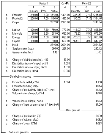 Описанная модель[22] позволяет рассчитать результаты реального процесса, процесса распределения доходов и производственного процесса на основе расчёта добавленной стоимости. Это единственная валидная мера связи между рентабельностью и производительностью, а также между реальным и производственным процессом. Пропуск любого входа в учёте автоматически означает его неограниченное использование, что приводит к искажению результатов.