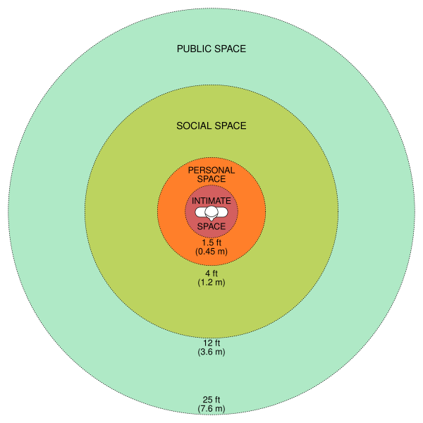 - общественная (3,65 м и более) — это расстояние между собеседниками, превышающее зону, зарезервированную для общественных контактов[2].