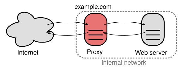 Прокси-сервер может находиться на локальном компьютере пользователя или в любой точке между компьютером пользователя и конечными серверами в Интернете. Прокси, который передаёт неизменённые запросы и ответы, обычно называется шлюзом или туннелирующим прокси. Прямой прокси — это прокси, ориентированный на Интернет, используемый для получения данных из различных источников (чаще всего — из любого места в интернете). Обратный прокси обычно используется внутри корпоративной инфраструктуры как фронт-энд, контролирующий и защищающий доступ к серверу в частной сети. Обратные прокси обычно также выполняют задачи балансировки нагрузки, аутентификации, расшифровки, кэширования и др[3].