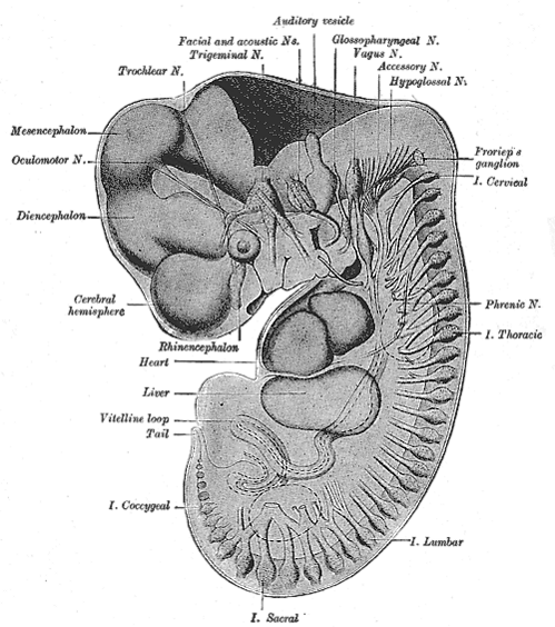 На этой стадии в развивающемся головном мозге эмбриона формируются три отдельных утолщения с полостями внутри, наполненными жидкостью (прообразом будущей спинномозговой жидкости) — три первичных мозговых пузыря. Самый передний называется передним мозгом, или прозэнцефалоном. Средний называется средним мозгом. Самый задний, имеющий форму, напоминающую ромб, называется ромбовидным мозгом.
