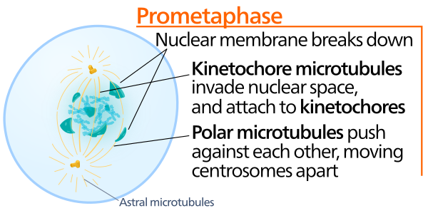 Начало прометафазы знаменуется разрушением ядерной оболочки, в результате чего хромосомы лежат беспорядочно в зоне бывшего ядра. В течение прометафазы хромосомы взаимодействуют с двумя центросомами и связанными с ними микротрубочками, формируя веретено деления. В самом начале прометафазы хромосомы, расположенные наиболее близко к одному из полюсов формирующегося веретена, начинают быстро приближаться к нему. Этот первичный асинхронный дрейф совершается за счёт микротрубочек. При этом отдельные микротрубочки, отходящие от полюсов, случайно сталкиваются с кинетохорами хромосом и захватываются ими. После этого хромосомы быстро (со скоростью около 25 мкм в минуту) скользят по микротрубочкам в направлении их минус-концов, приближаясь к полюсам, от которых исходят связанные микротрубочки. Кинетохоры могут взаимодействовать с боковой поверхностью таких микротрубочек. Таким образом, хромосомы оказываются случайным образом приближеннами к полюсам веретена деления. На полюсах продолжается формирование новых микротрубочек, причём чем ближе кинетохор находится к полюсу, тем выше вероятность его взаимодействия с другими микротрубочками. Новые плюс-концы микротрубочек захватываются кинетохором; в результате кинетохор оказывается связанным с целым пучком микротрубочек, растущих на плюс-концах. На другой сестринской хроматиде происходит такой же процесс, поэтому силы, тянущие хромосомы к разным полюсам, оказываются равными, и в конце концов хромосомы останавливаются в экваториальной плоскости[2]. Сложные движения, которые совершают хромосомы при прикреплении к веретену, называются конгрессией хромосом. Прометафаза продолжается до тех пор, пока все хромосомы не будут расположены в экваторе веретена деления на полпути между полюсами[3].