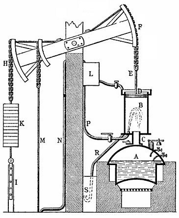 Первой попыткой использования парового двигателя в промышленности считается водяной насос Томаса Севери, запатентованный в 1699 году. Но он не был успешным из-за частых взрывов бойлера и ограниченной мощности. Более совершенной была машина Томаса Ньюкомена, разработанная к 1712 году[9][10]. По-видимому, Ньюкомен использовал ранее полученные экспериментальные данные Дени Папена, который изучал давление водяного пара на поршень в цилиндре и поначалу нагревание и охлаждение пара для возвращения поршня в исходное состояние производил вручную.