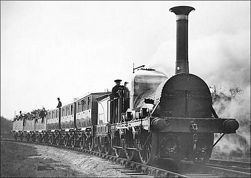 Огромное значение имело появление железных дорог. Первый паровоз был построен в 1804 году Ричардом Тревитиком. В последующие годы многие инженеры пытались создавать паровозы, но самым удачливым из них оказался Георг Стефенсон, который в 1812—1829 года предложил несколько удачных конструкций паровозов. Его паровоз был использован на первой в мире железной дороге общественного пользования из Дарлингтона к Стоктону, открытой в 1825 году. После 1830 года в Великобритании началось быстрое строительство железных дорог. Вскоре первые железные дороги появились и в странах континентальной Европы. К середине XIX века во всех развитых (на тот момент) странах были созданы обширные железнодорожные сети, а в 1869 году в США была открыта Первая трансконтинентальная железная дорога.