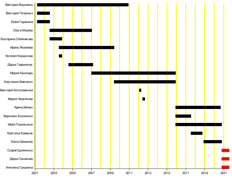 | Сентябрь 2001 — август 2002 | Виктория Воронина | Виктория Петренко | Юлия Гаранина | ||