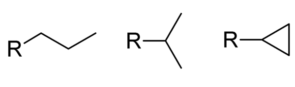 К этим двум радикалам можно условно добавить циклопропил, одновалентный радикал циклопропана (обозначение: c-Pr), который тоже имеет углеродный скелет из трёх атомов. Но, во-первых, формула циклопропила C3H5•, т. е. он не изомерен линейным пропилу и изопропилу; во-вторых, его циклическая топология приводит к образованию «банановых связей», что сильно изменяет его химию по сравнению с другими пропилами.