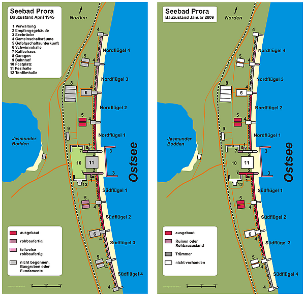 Планы Гитлера в отношении Проры были амбициозными. Он хотел обширный морской курорт, «самый мощный и величайший из когда-либо существовавших», вместимостью 20 000 коек. Планировалось построить восемь 550-метровых, шестиэтажных, полностью идентичных блоков с общей площадью 10 000 номеров для размещения туристов. Массивные здания были построены. Bсе комнаты должны были выходить на море, а коридоры и санитарные помещения расположены на другой стороне. Каждая комната была 5x2,5 метрa, имела две кровати, шкаф и раковину. На каждом этаже были общие туалеты и душевые.