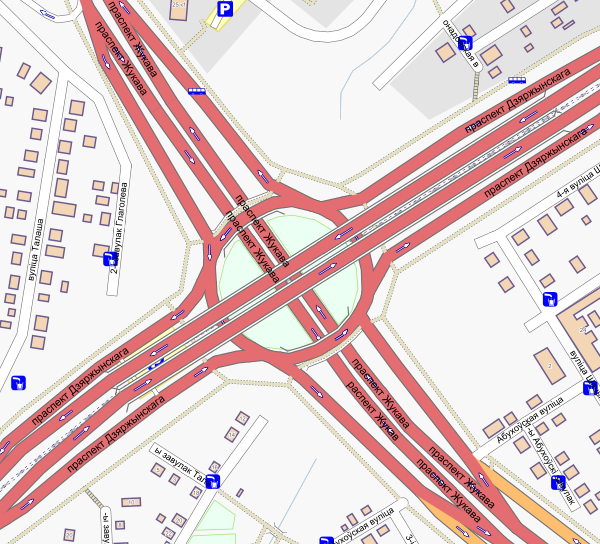 Проспект Жукова проходит по нижнему уровню единственной в Беларуси трёхуровневой транспортной развязки (под проспектом Дзержинского). Третий уровень развязки был построен в 2011 году.