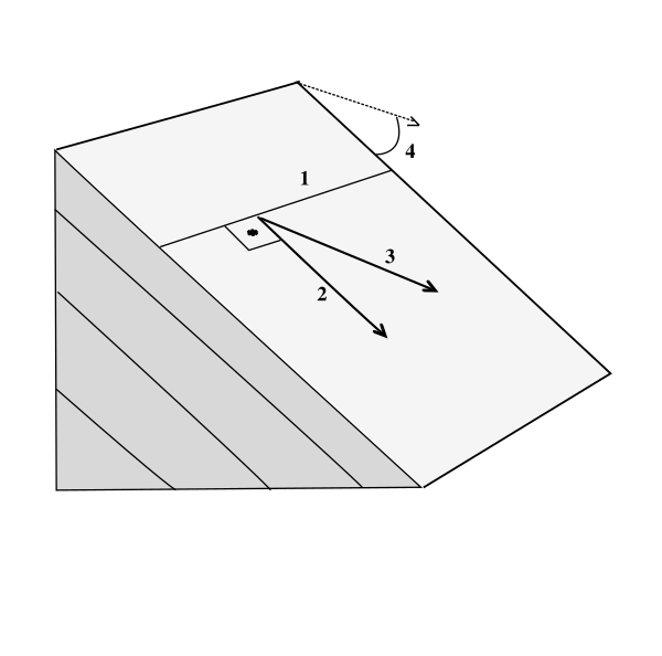 - Определение. Угол падения (р.1,a) — угол между геологической поверхностью и горизонталью в данной точке, измеренной между горизонталью и линией наибольшего наклона этой поверхности.