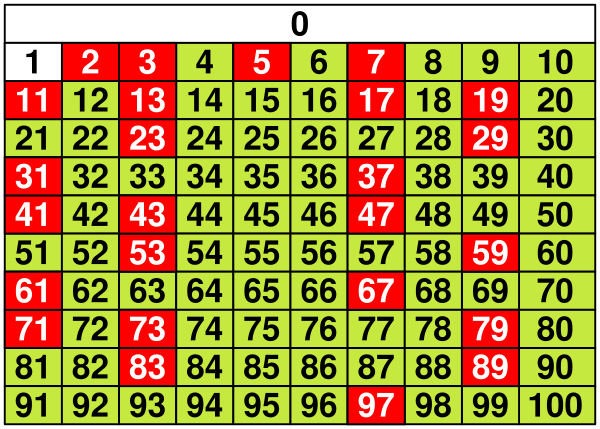 - 2, 3, 5, 7, 11, 13, 17, 19, 23, 29, 31, 37, 41, 43, 47, 53, 59, 61, 67, 71, 73, 79, 83, 89, 97, 101, 103, 107, 109, 113, 127, 131, 137, 139, 149, 151, 157, 163, 167, 173, 179, 181, 191, 193, 197, 199, …[3]