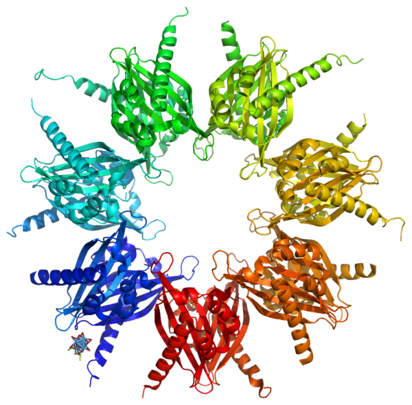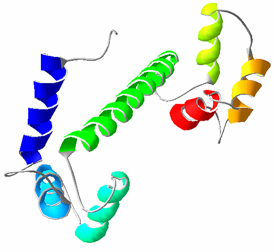 Кальмодулин (СаМ) — это вездесущий, кальций-связывающий белок, который связывается с многими другими белками и регулирует их активность. Это маленький кислый белок, состоит из 148 аминокислотных остатков, содержит четыре домена связывания кальция.[24]