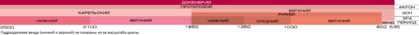 В российской стратиграфической шкале протерозой тоже присутствует, но является не эоном, а акроном — более высоким делением (таким же делением является ещё и архей). Протерозой поделён на два эона: нижнепротерозойский или карельский (от 2500 до 1650 млн лет назад) и верхнепротерозойский (от 1650 до 535 млн лет назад). Карельский эон подразделяется на две эры (в скобках длительность в млн лет): нижнекарельская (2500—2100) и верхнекарельская (2100—1650). В состав верхнего протерозоя входит рифей (1650—600 млн лет назад), который имеет статус подэона и делится на три эры (см. ниже). Завершает протерозой вендский период (600—535 млн лет назад)[19].