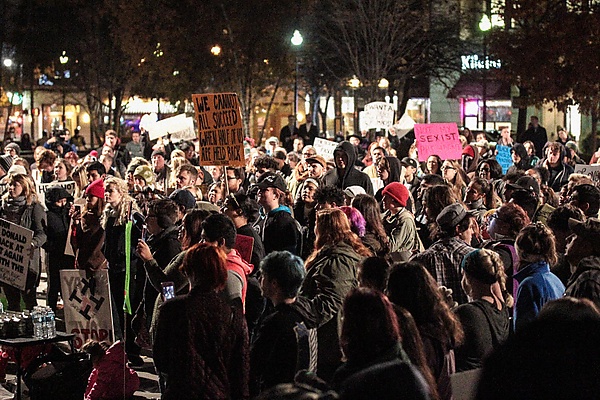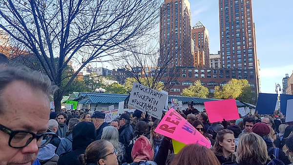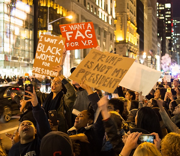 9 ноября 2016 года во многих крупных городах США начались акции протеста. В Нью-Йорке были задержаны десятки участников демонстраций; общее количество участников превысило несколько тысяч человек. Среди их лозунгов: «Не мой президент», «Дональд Трамп, уходи! Расист, сексист, антигей!»[2][3][4].