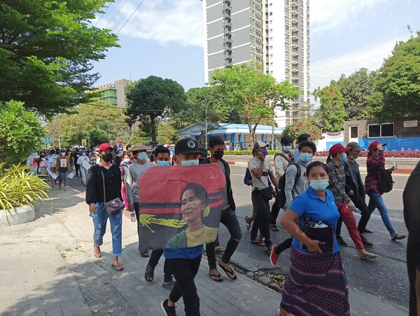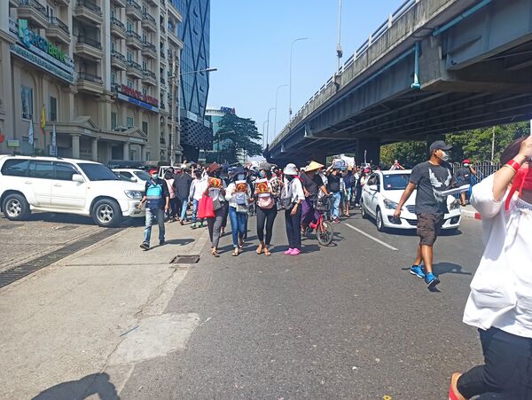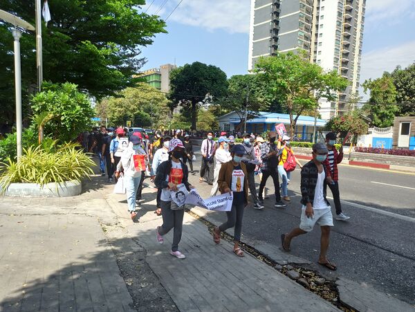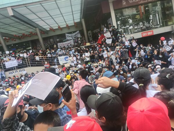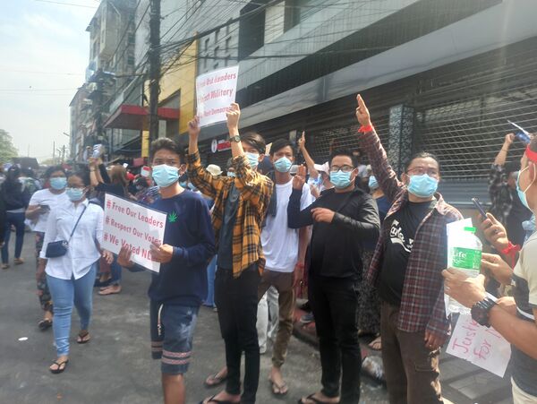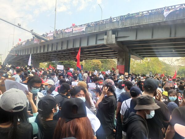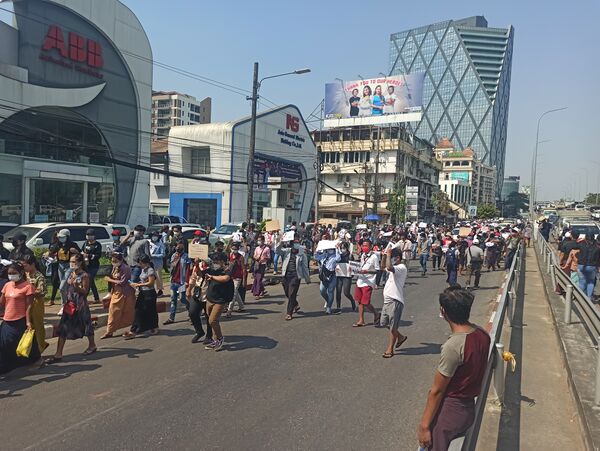 6 февраля в городе Янгон прошла протестная акция против военного переворота с участием 3000 демонстрантов[15]. На улицах Янгона были развернуты бойцы полиции Мьянмы, водомёты и бамбуковые баррикады с колючей проволокой[15]. Государственный административный совет в ответ ввёл в Мьянме частичное отключение Интернета, чтобы предотвратить использование соцсетей для подстрекательства к беспорядкам и протестам в городах Мьянмы[16].
