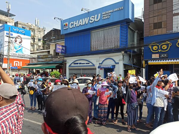 7 февраля, во время акции протеста в городе Мьявади, полиция Мьянмы произвела несколько выстрелов в воздух резиновыми пулями[17]. В городе Мандалай прошла акция протеста против военного переворота в Мьянме с участием нескольких тысяч человек, 300 мотоциклов и 50 автомобилей[18]. В городе Янгон на акции протеста против военного переворота вышли 60 тысяч человек[19]. Также более 500 демонстрантов, среди которых много этнических китайцев, вышли на акцию протеста в городе Лашо на севере Мьянмы[20].
