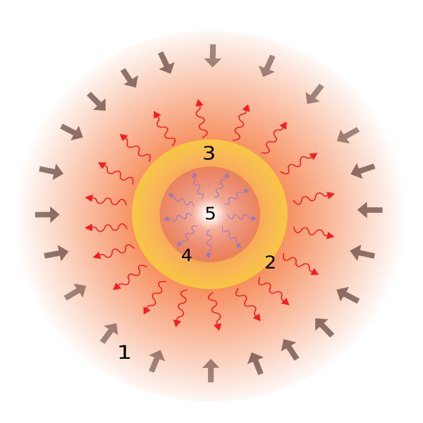 В результате сжатия выделяется энергия, но из-за того, что облако прозрачно для инфракрасного излучения с длиной волны более 10 мкм, вся она излучается в окружающее пространство. Однако облако постепенно уплотняется, становится всё более непрозрачным для собственного излучения и в какой-то момент начинает нагреваться[19][3].
