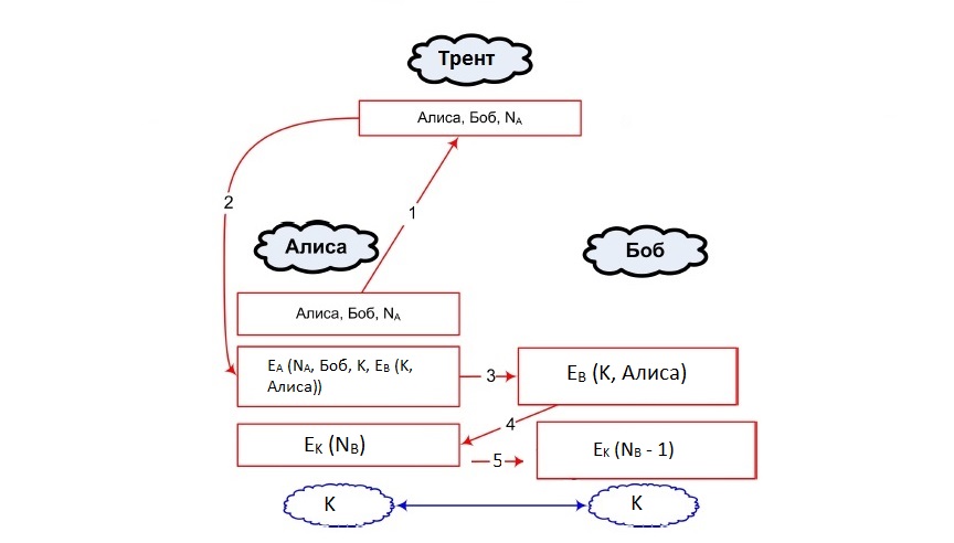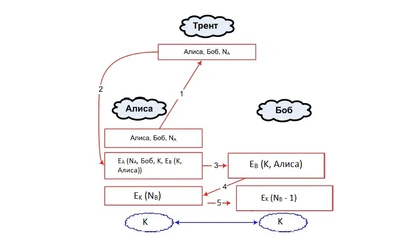 - 3 действующих лица: клиенты Алиса и Боб, которые хотят получить ключ для общения между собой, Трент — доверенный центр.