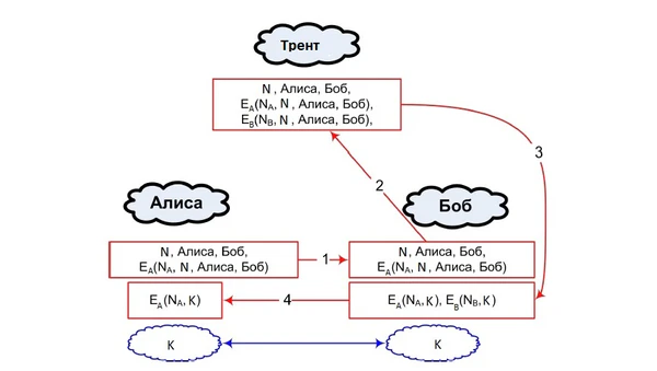 - Боб получает сообщение, расшифровывает его общим с Трентом ключом и проверяет метку времени TA и идентификатор Алисы. Если сообщение прошло проверку, то теперь Боб имеет общий с Алисой ключ.