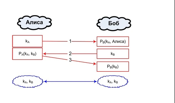 - Теперь очередь Алисы доказать Бобу, что она — Алиса. Чтобы это сделать, она должна уметь расшифровывать сообщения, зашифрованные ключом PA. С чем она прекрасно справляется — она расшифровывает сообщение от Боба, забирает оттуда kA и отправляет Бобу сообщение, содержащее его ключ kB.