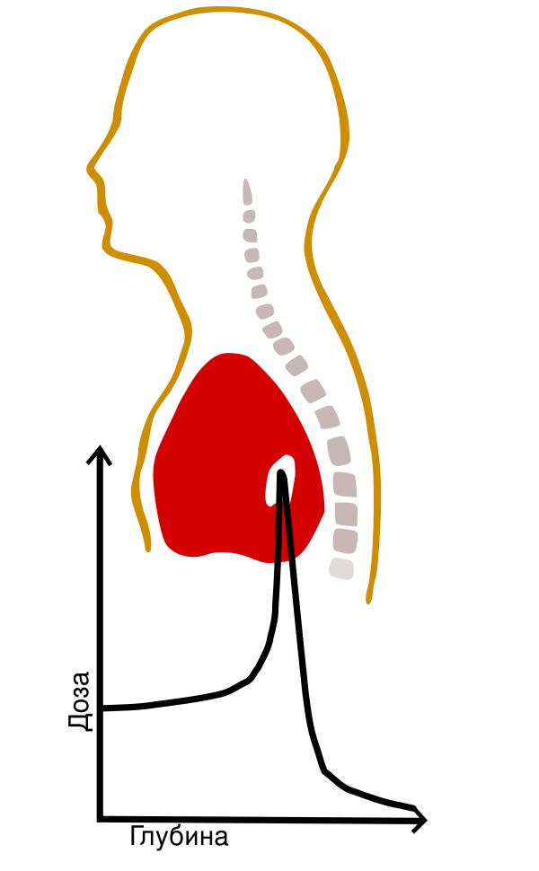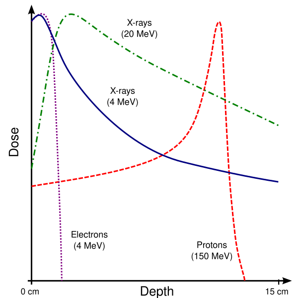 Благодаря сравнительно большой массе протоны испытывают лишь небольшое поперечное рассеяние в ткани, а разброс длины их пробега очень мал; пучок можно сфокусировать на опухоль, не внося неприемлемых повреждений в окружающие здоровые ткани. Все протоны заданной энергии имеют совершенно определенный пробег; ничтожное их число превышает это расстояние. Более того, практически вся радиационная доза выделяется в ткани на последних миллиметрах пробега частиц; этот максимум называют Брэгговским пиком. Местоположение Брэгговского пика зависит от энергии, до которой были разогнаны частицы в ускорителе, эта энергия в большинстве случаев должна находиться в диапазоне от 70 до 250 миллионов электронвольт (Мэв). Следовательно, появляется возможность сфокусировать область разрушения клеток протонным пучком в глубине здоровой ткани, окружающей опухоль; ткани, расположенные до Брэгговского пика, получают некоторую незначительную дозу. Более того, эта доза может быть ещё уменьшена за счет прецизионного вращения либо самого пучка вокруг пациента с помощью специального устройства гантри, либо прецизионного вращения всего тела пациента при пространственно стабильном пучке протонов. Ткани, расположенные за Брэгговским пиком, практически не получают ионизационной дозы.