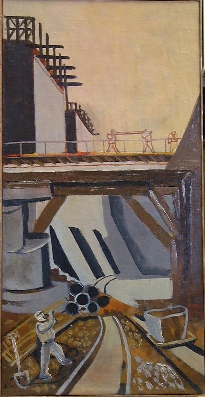 В центре композиции представлены элементы индустриального пейзажа: на переднем плане проходят две линии рельсов, по одной из которых движется рабочий, несущий на плече доски, а рядом расположена вагонетка. На втором плане слева возвышается массивное сооружение плотины, изображённое в профиль, от которого отходит виадук. По виадуку справа налево идут двое рабочих с досками, ещё один рабочий стоит рядом. Работа выполнена в тёплой охристо-коричневой цветовой гамме, что подчёркивает атмосферу строительной площадки.