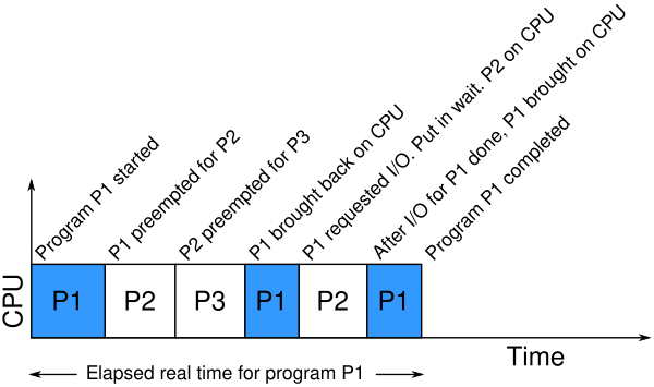 - Системное время — время, в течение которого процессор занят исполнением кода в пространстве ядра. Для потока или процесса это промежуток времени, когда ядро работало от его имени, например, после выполнения системного вызова.