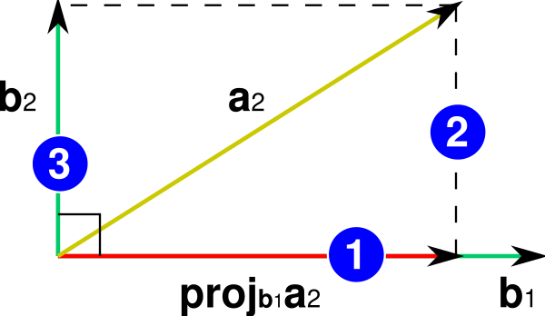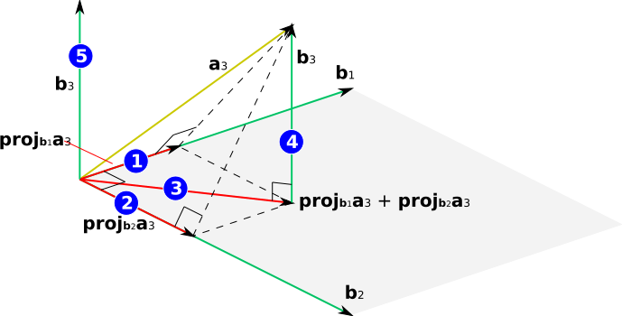 Таким образом, в процессе Грама — Шмидта для вычисления выполняется проецирование ортогонально на гиперплоскость, натянутую на векторы . Вектор затем вычисляется как разность между и его проекцией. То есть — это перпендикуляр от к гиперплоскости, натянутой на векторы . Поэтому ортогонален векторам, образующим эту гиперплоскость.