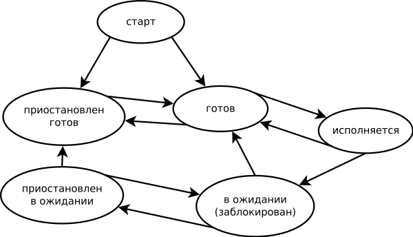Процесс, помимо главного рабочего состояния, может находиться в других состояниях, например ожидания.