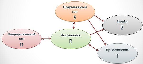 - D — непрерываемый сон — процесс ожидает определённого события;