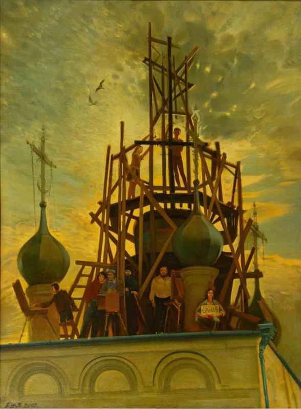 Многофигурная композиция разворачивается на плоской крыше четверика пятикупольной церкви. В левой части у этюдника изображён художник за работой, за процессом наблюдают двое студентов. Справа на корточках расположена девушка с табличкой "кузьма" на груди. В центре выделяются фигуры взрослого преподавателя, смотрящего на зрителя, и священника в облачении, опирающегося на доску. На фоне видны купола храма, три из которых украшены крестами, а центральный купол окружён строительными лесами. На лесах стоят девочка и мальчик, развешивающие цветочную гирлянду. Верхняя часть картины озарена заходящими лучами солнца, а облака изображены в форме брызг воды.