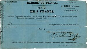 В 1848 году в работе «Решение социальной проблемы» Прудон разработал теорию кредита с нулевой процентной ставкой. Замысел состоял в создании «народного банка», целью которого является упразднение денег, как фактора, который позволяет взимать проценты и создание обменной структуры, которая заменит механизмы денежного обмена в рамках товарных обменных структур между отдельными людьми.