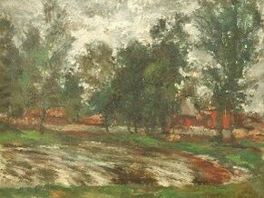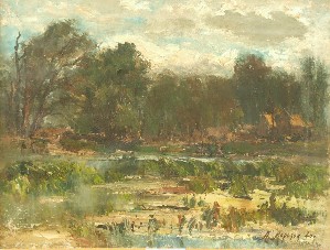 На переднем плане картины изображён заросший пруд, занимающий значительную часть композиции. На втором плане слева выделяются засохший ствол и два дерева, растущие с наклоном вправо, что придаёт сцене динамику. По горизонтали проходит ряд деревьев, сквозь которые на фоне зелёного массива видны деревянные постройки. Небо покрыто белыми и серыми облаками, подчёркивающими пасмурную летнюю атмосферу.