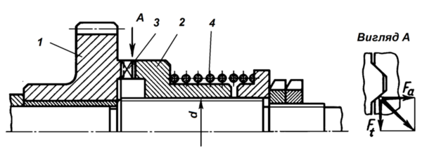 От действия окружной силы Ft в зацеплении возникает осевая сила Fa=Fttgα, которая стремится раздвинуть полумуфты и вывести их из зацепления. Этому противодействует сила пружины F и сила трения в кулачках и шлицевом или шпоночном соединении. С учётом этих сил условия равновесия полумуфты (2) можно записать в виде: